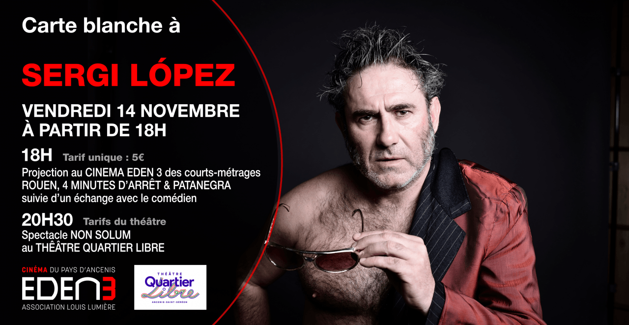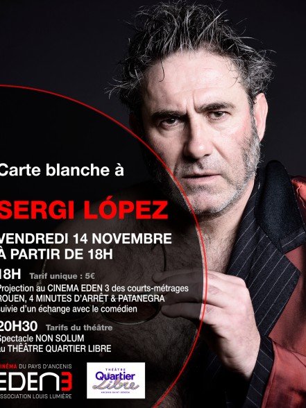 › 18h (au cinéma Eden 3) : projection de deux courts métrages avec Sergi López, en présence du comédien : Rouen, cinq minutes d’arrêt d’Ingrid Gogny (1996, 15 min) // Patanegra de Méryl Fortunat-Rossi (2022, 19 min)