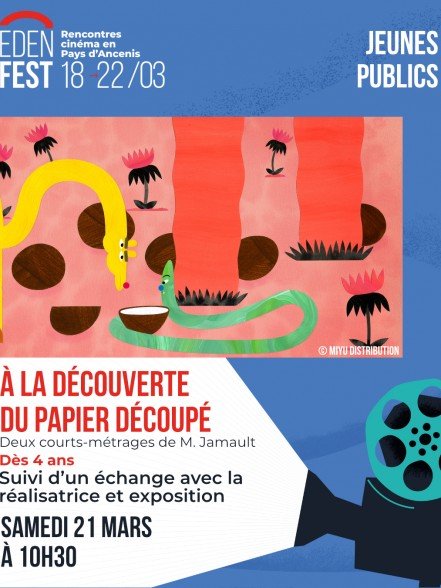 Deux courts-métrages de Marion Jamault (Dès 4 ans) Animation en papier découpé, Fantastique, Conte - 18 min Plongez dans l’univers poétique et coloré en papier découpé de Marion Jamault avec ses deux courts-métrages Filante et Naissance des Oasis. Sur un fond musical rythmé, des amitiés improbables naissent dans des mondes graphiques aux contrastes affirmés, aussi tendres qu’inattendus. Découvrez les décors des films dans le hall du cinéma ! Suivi d’un échange avec Marion Jamault, la réalisatrice.